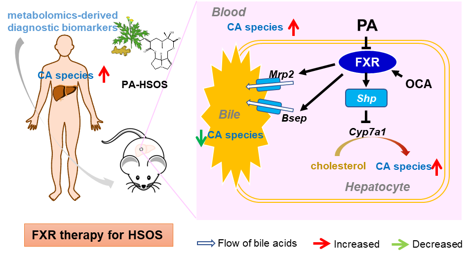 中草药引起的药源性肝损伤近年来成为国内外关注的热点问题。中药安全用药窗口及毒性作用靶标机制不清,严重限制了其现代化国际化应用。在目前所报道的中草药引起的药物性肝损伤中,千里光、菊三七中所含有的吡咯里西啶生物碱(pyrrolizidine alkaloids,PAs)引起的肝窦阻塞综合征(hepatic sinusoidal obstruction syndrome,HSOS)首当其冲,也是与其他药源性肝损伤区别最显著的病症,引起了世界范围内的持续关注。该团队前期对含有PAs的中草药进行了系统的资源调查、化学成分、代谢及毒性评价研究,并通过代谢组学、基因组学、蛋白组学等系统生物学手段对PAs的肝毒性作用机制进行了探讨(Archi Toxicol, Food Chem Toxicol, Chem Biol Interact, Phytochemistry,Acta Pharmacol Sin等),发现HSOS为肝实质细胞损伤与胆汁淤积造成的混合性肝损伤,然而目前国内外对HSOS致胆汁淤积的研究较少。该研究进一步从真实世界菊三七致HSOS的临床样本分析入手,发现HSOS患者初级胆汁酸合成通路异常,特别是血清胆酸及其牛磺酸、甘氨酸结合物异常升高,可有效诊断HSOS(ROC曲线下面积为0.968,95% 置信限0.908–0.994,灵敏度83.87%, 特异性 96.55%)。HSOS患者肝组织胆汁酸代谢调控关键核受体法尼酯X受体(farnesoid X receptor, FXR)的表达显著降低,体外及动物实验提示PAs通过抑制肝脏FXR/SHP通路增强胆汁酸合成造成淤积性肝损伤,而FXR激动剂奥贝胆酸可改善PAs致实验性HSOS,有效降低血清胆酸及其牛磺酸、甘氨酸结合物水平。