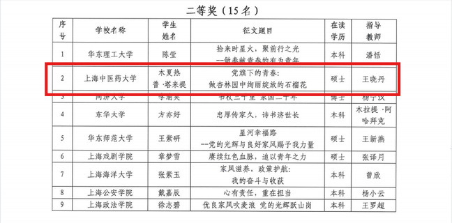 近日,上海市学生事务中心公布“党的光辉暖人心 我的家风伴成长”资助育人主题征文评选结果。BEAT365《党旗下的青春:做杏林园中绚丽绽放的石榴花》(作者:木夏热普·塔来提,指导教师:王晓丹)和《做一粒种子,成就一棵树的昂扬》(作者:麦迪努尔·图尔贡,指导教师:薛聪聪)双双荣获二等奖。