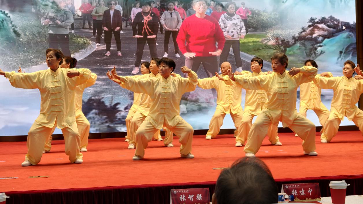 在展演环节,各类演出精彩纷呈,获得台下观众阵阵热烈掌声和欢呼。展演的节目有养生功法社团带来的《健身气功八段锦》、老朋友摄影社团的《秋月映旗袍》、歌咏社团的《花又落》、棋牌社团的《荷塘月色》、太极拳社团的《全套八式太极》,以及养心书法社和巧手社带来的展示。另外还有龙华医院退休教职工献上小组唱《绣红旗》,曾在歌咏比赛中获奖的封苏宇老师独唱《我爱你 中国》。