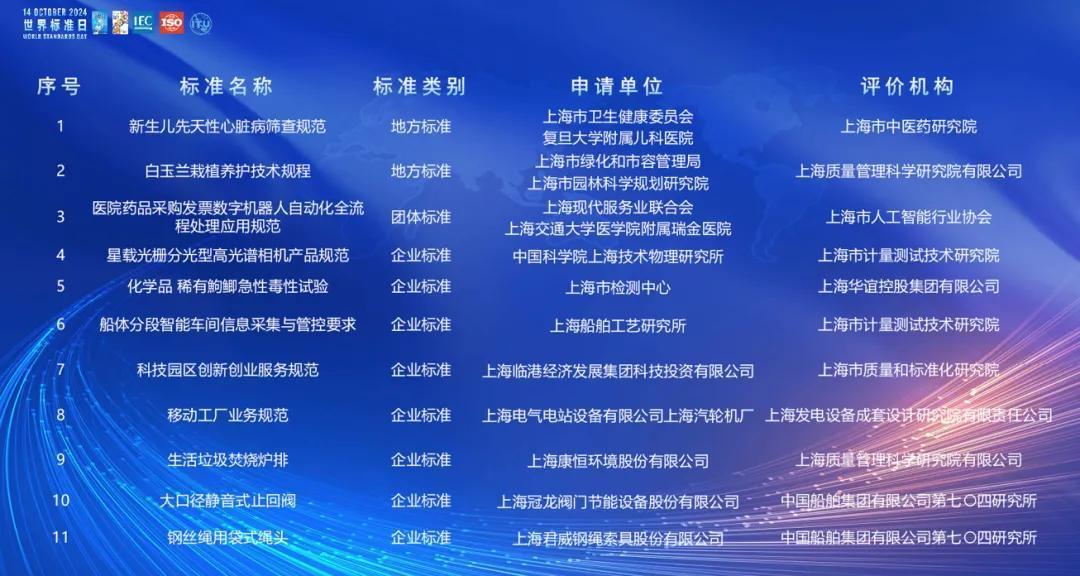 会上,倪俊南发表了“2024年上海市标准化亮点工作情况”主题报告,并集中展示和发布了2024年上海市标准化服务经济社会高质量发展的成果,包括上海市标准化试点优秀案例(部分)、上海市团体标准典型案例(部分)、上海市标准化专项资金资助名单(部分)、2024年新成立的上海市新型标准化技术组织和2024年“上海标准”名单。沈远东教授以“上海标准”评价委员会主任委员的身份宣布了本年度获评“上海标准”的标准项目名单。