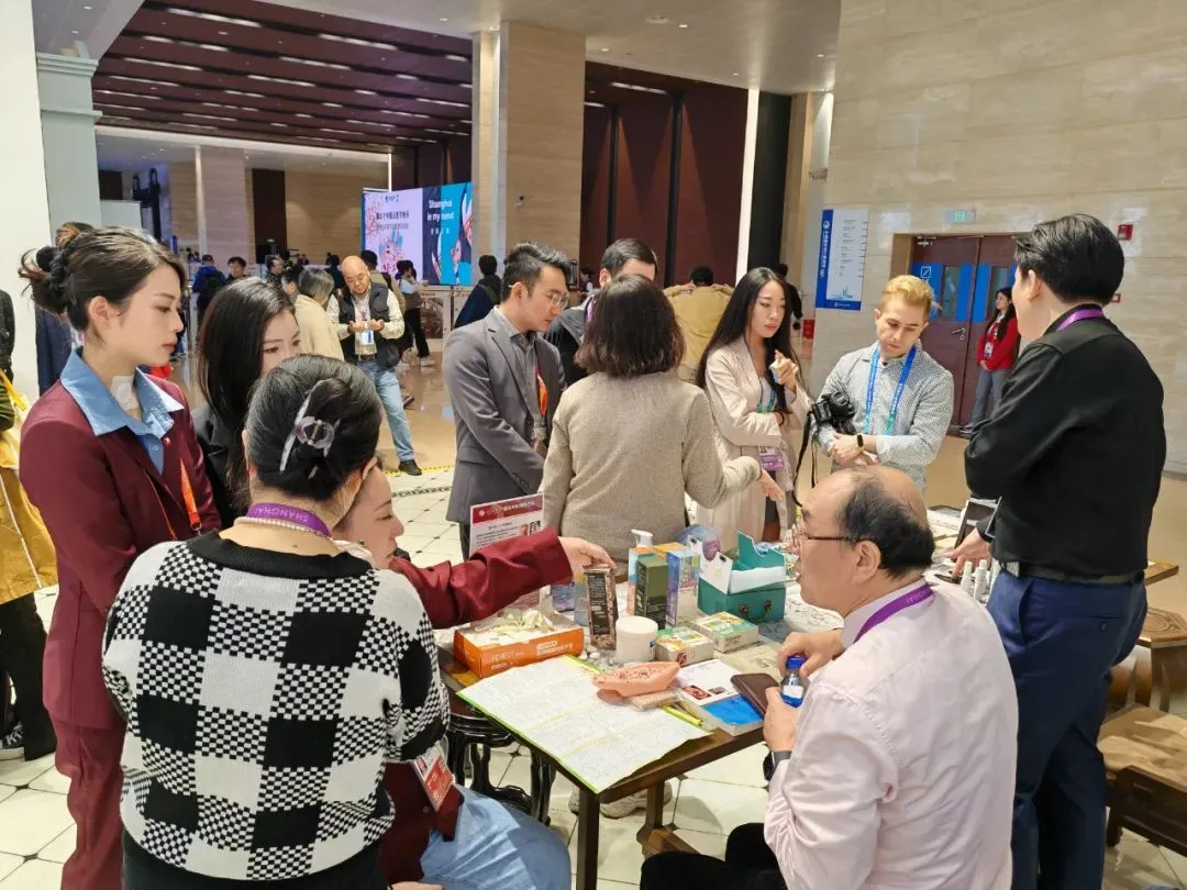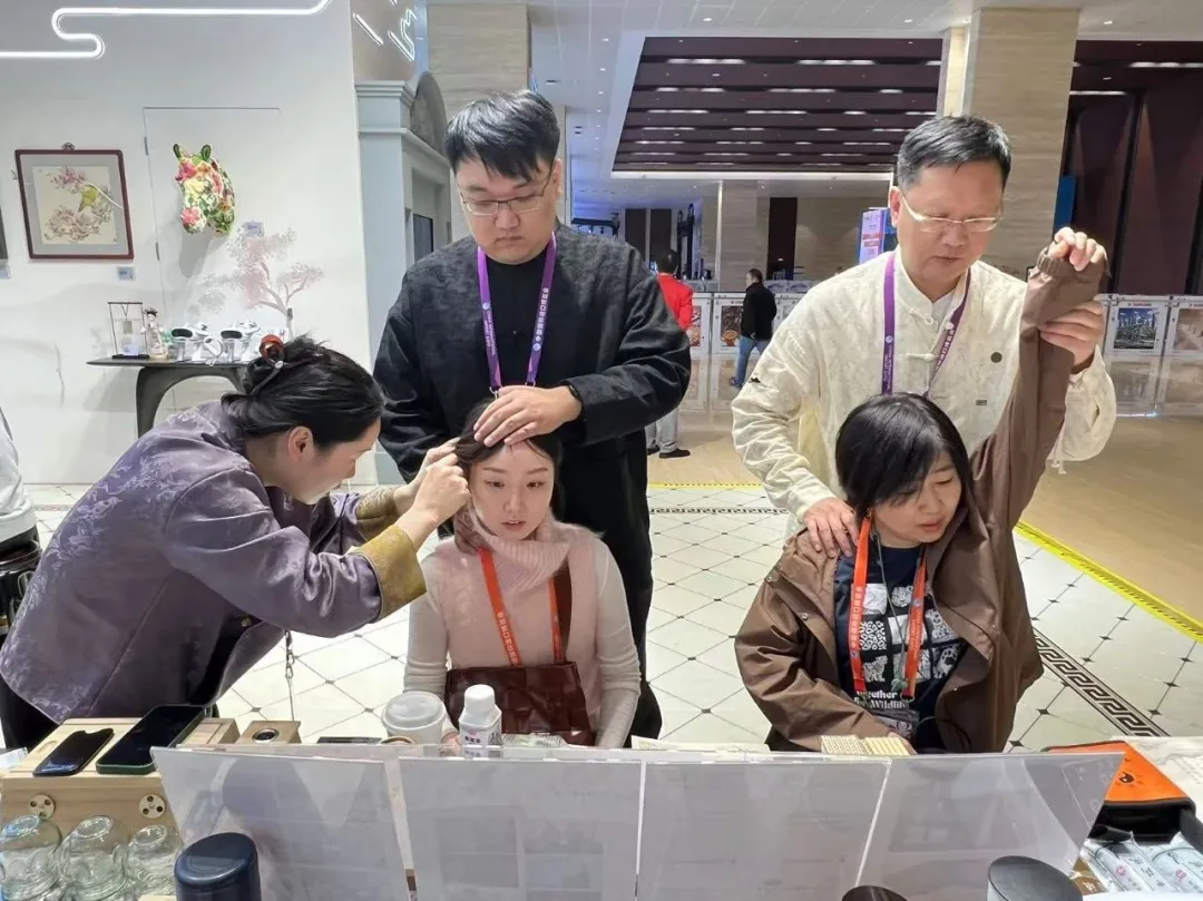 11月8日,夏氏外科第五代传人、曙光医院传统外科副主任周绍荣为参观者现场展示夏氏外科消瘿散结膏、疏气解郁穴位贴等外用制剂。夏氏外科第五代传人、曙光医院皮肤科主任医师张慧敏教授现场向宾客介绍并展示了夏氏外科特色疗法“耳穴压豆——中医美容”。将王不留行子贴压于耳廓穴位,给予适当的捏、揉、压、按,使其产生痛、胀、麻、酸等刺激反应,达到运行气血、抒情达志、调节脏腑、平衡阴阳的作用,从而实现祛痘、淡斑、抗皱等美容效果,同样吸引了众多宾客前来。