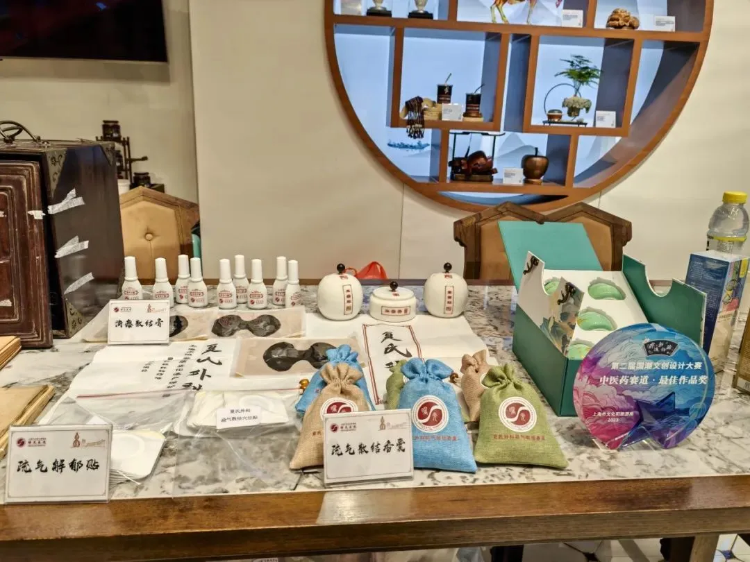 荣获2023“非遗新体验”国潮文创设计大赛中医药赛道最佳作品奖和最具潜力奖的曙光医院“海派夏氏外科箍围药套装盒”在场馆内首次展出。“箍围法”是海派夏氏外科非遗外治法之一。箍围药粉经湿调,可辨证治疗疖肿、痤疮、丹毒等体表感染性、过敏性疾病。“海派夏氏外科箍围药套装盒”分为上下两层,分别内含箍围药粉及调制工具、器皿,并附有通俗易懂的操作文案。产品外观精美,承袭中医古药箱、药罐、文案之古风,可作为百姓日常居家操作夏氏外科非遗技术的常备物品。
