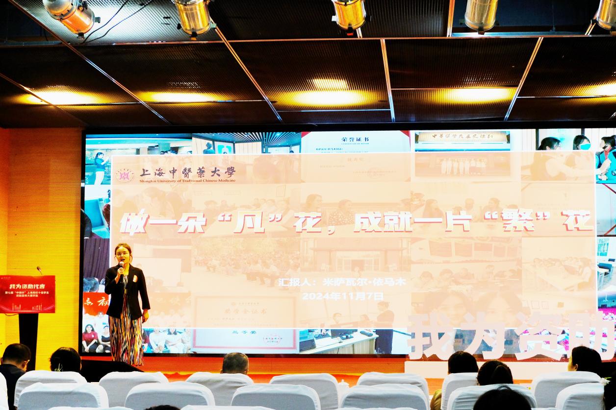 比赛现场,来自全市43所高校的优秀资助宣传大使结合自身接受资助、励志成长的经历,围绕资助宣传的主题分享各自开展的各具特色的宣传活动。米萨瓦尔·依马木以“做一朵‘凡’花,成就一片‘繁’花”为主题,讲述了自己与资助的深厚渊源。