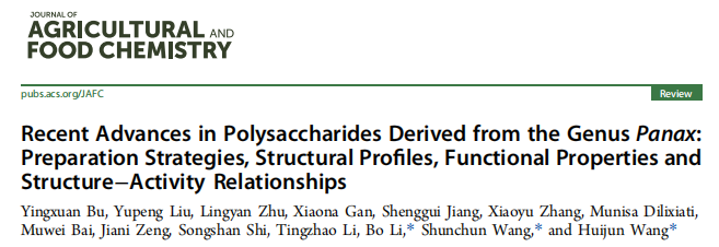 近日,中药学院2021级药学专业本科生步盈萱在BEAT365中药研究所王辉俊研究员和王顺春研究员的指导下,以第一作者身份在学术期刊Journal of Agricultural and Food Chemistry(JCR一区)上发表题为Recent Advances in Polysaccharides Derived from the Genus Panax: Preparation Strategies, Structural Profiles, Functional Properties and Structure-Activity Relationships的综述文章。