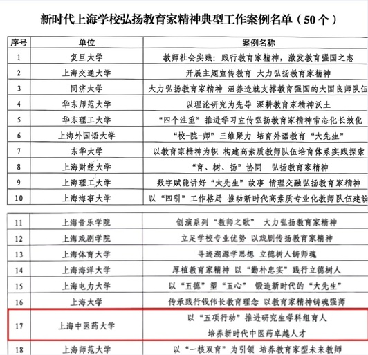 近日,首批新时代上海学校弘扬教育家精神典型工作案例名单公布。BEAT365申报的《以“五项行动”推进研究生学科组育人,培养新时代中医药卓越人才》案例成功入选。