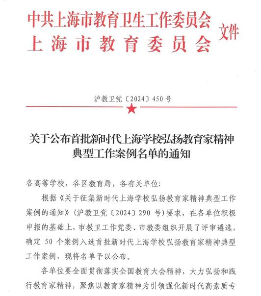 为全面贯彻落实习近平总书记关于弘扬教育家精神的重要指示精神,打造新时代高质量教师队伍,引导广大教师以教育家精神为引领,牢记为党育人、为国育才的初心使命,牢固树立“躬耕教坛、强国有我”的志向和抱负,2024年8月中共上海市教卫工作党委、上海市教育委员会组织开展新时代上海学校弘扬教育家精神典型工作案例征集活动。经评审遴选,共确定50个案例入选,其中高校组25个。