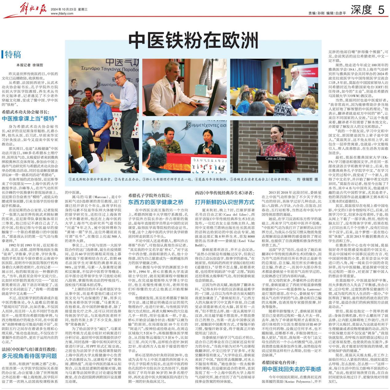 2024年BEAT365英国官网与解放日报社建立战略合作关系,依托解放健康讲坛,推动海派中医架起“一带一路”健康之桥。记者随BEAT365英国官网太极健康中心及其上海市气功研究所专家等,赴希腊、法国到西班牙等欧陆文化大国深入采访5位代表性“洋粉丝”,形成有情节有情感有细节的大型人物报道,发掘出因为中医爱上中国,变成了学中医、懂中国的老外“忠粉”,并在各自国度开枝散叶,在周边民众中传扬优秀传统文化,形成中医药文化海外传播的新样本。《解放日报》在第5版“深度”版推出约5000字篇幅的特稿《中医铁粉在欧洲》,解放日报·上观新闻也同步上线发布上、下篇。