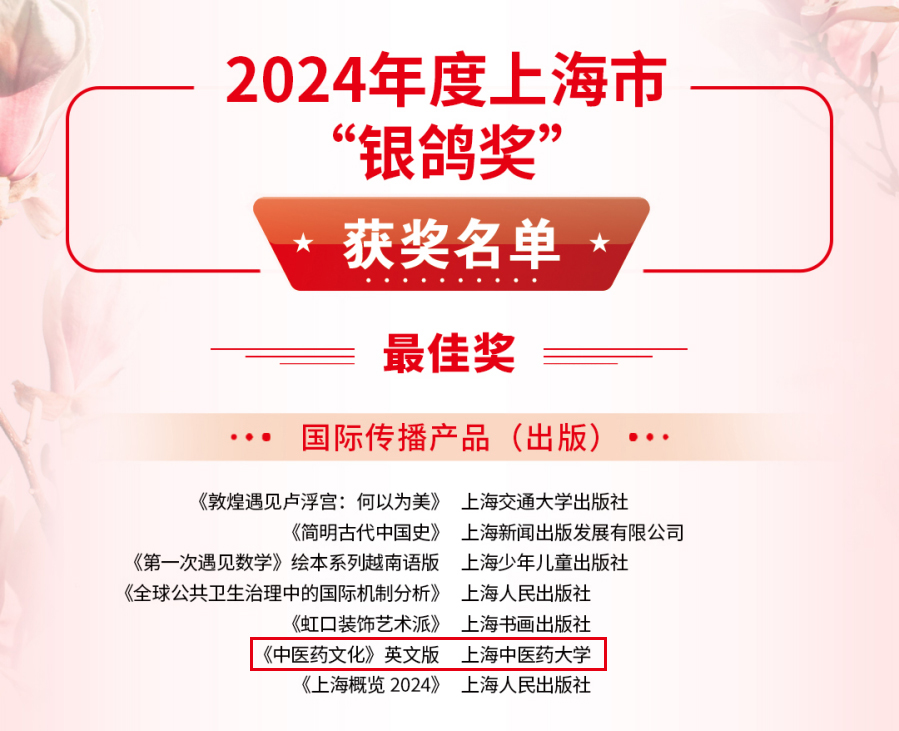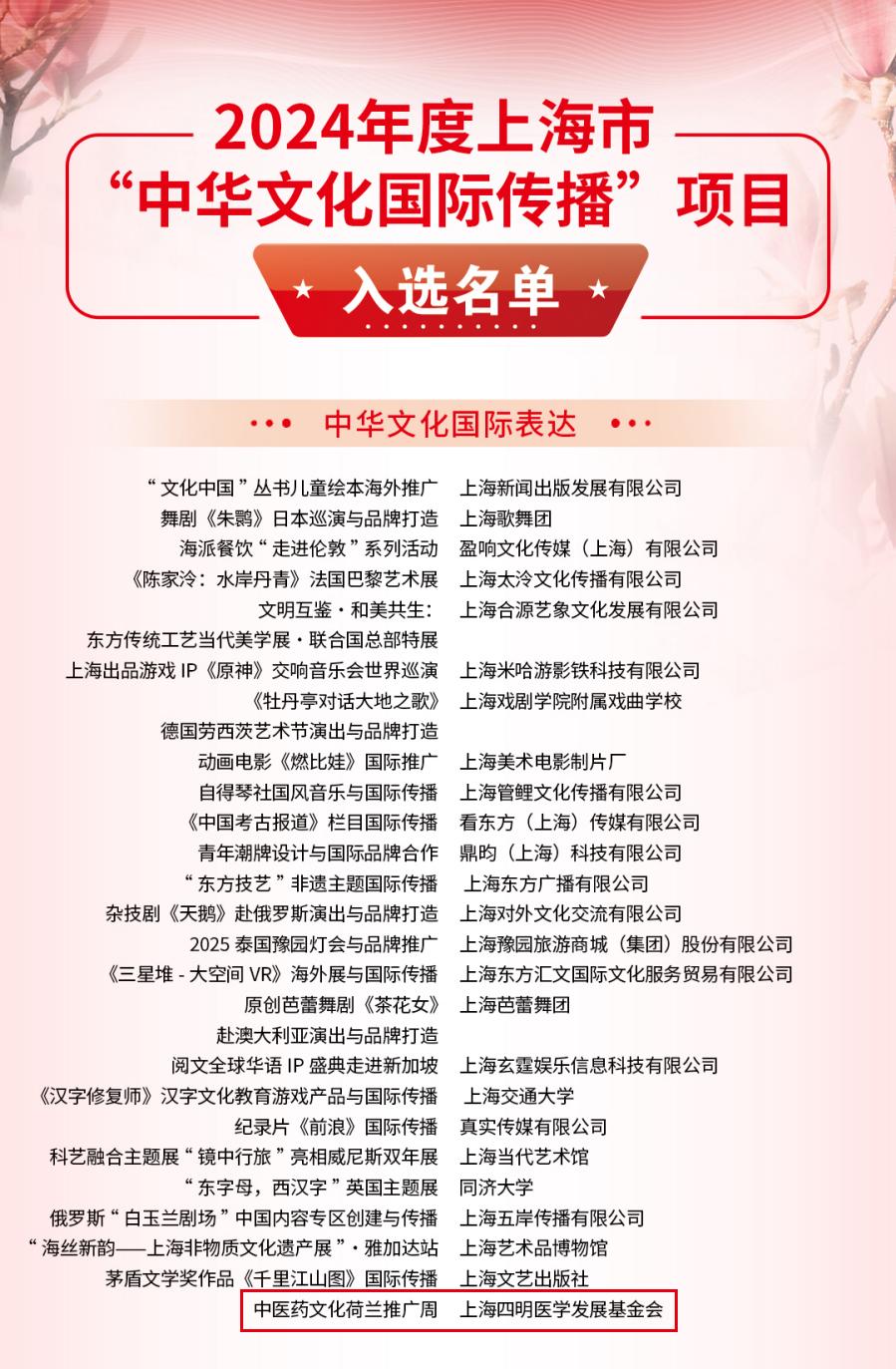 BEAT365申报的《中医药留学生“周周看上海”国际传播》入选2024年度上海市“中华文化国际传播”项目(国际朋友圈拓展),《中医药文化》英文版荣获2024年度上海市“银鸽奖”国际传播产品(出版)最佳奖。上海四明医学发展基金会申报的《中医药文化荷兰推广周》入选2024年度上海市“中华文化国际传播”项目(中华文化国际表达)。