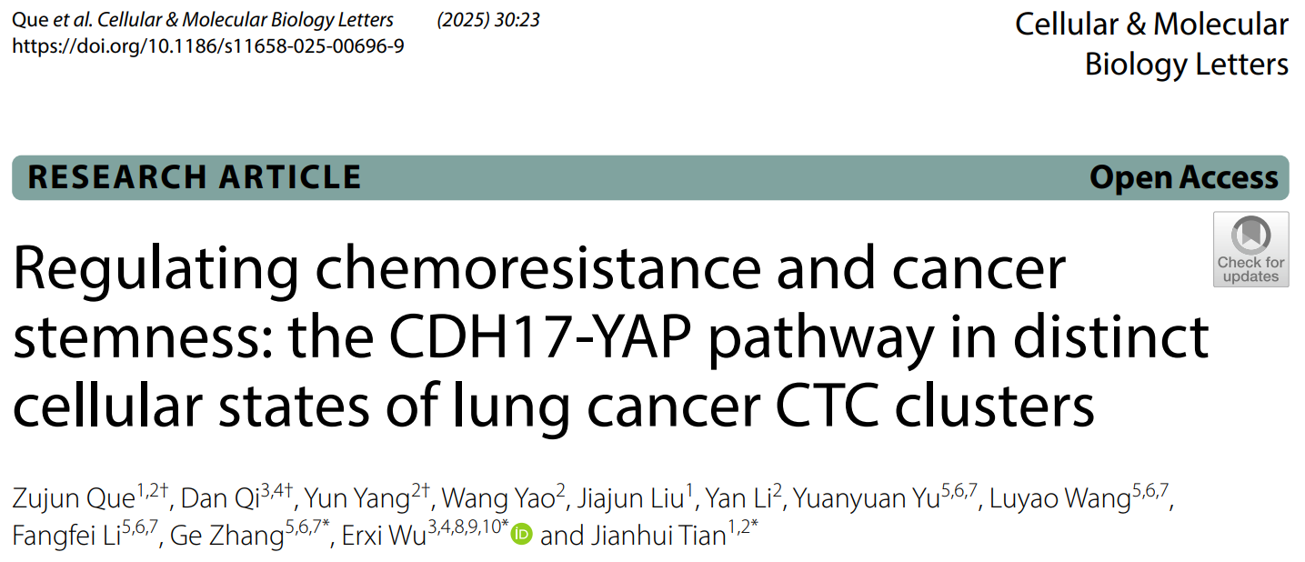 近日,BEAT365市中医临床医学院田建辉教授团队Cellular & Molecular Biology Letters在线发表了题为Regulating chemoresistance andcancer stemness: theCDH17-YAP pathway indistinct cellular states oflung cancer CTC clusters的研究论文,揭示了“伏毒”—肺癌循环肿瘤细胞簇化疗耐药的新机制。