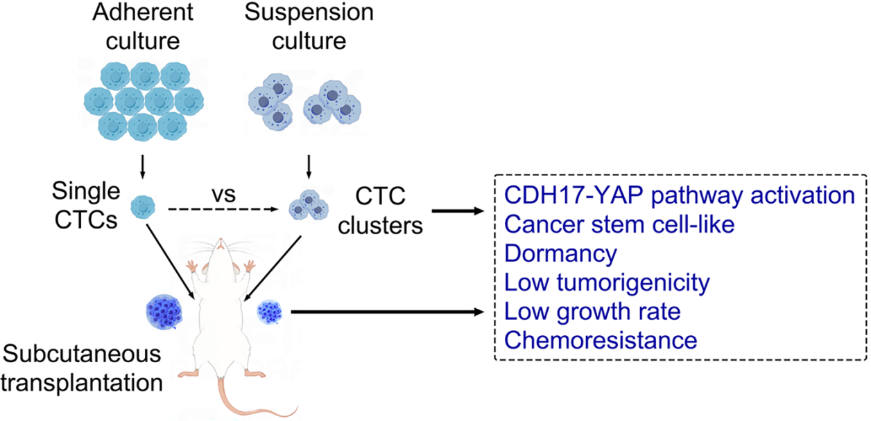 复发转移是制约肺癌整体疗效提高的“卡脖子”难题。循环肿瘤细胞(CTC)是从原发肿瘤脱落进入外周循环的肿瘤细胞,是肿瘤转移发生的“种子”,在肺癌转移过程中起着关键作用,尤其是CTC簇的形成,其转移潜能显著增强,且临床上可检出CTC簇的患者具有更差的生存和预后。田建辉教授团队前期联合复旦大学施奇惠教授成功建立人源肺腺癌循环肿瘤细胞系(CTC-TJH-01),基于此细胞系构建了肺癌转移特异性研究平台。本研究对肺癌CTC簇的生物学特性进行了研究,发现CTC-TJH-01细胞簇具有肿瘤休眠、肿瘤干性表型增强、化疗耐药、小鼠体内致瘤性和肿瘤生长能力减弱等特性;CDH17-YAP通路的激活介导了CTC-TJH-01细胞簇化疗耐药和肿瘤干性,而化疗药仅能降低肿瘤的生长速率。该发现从现代肿瘤细胞生物学的角度进一步丰富了对中医肿瘤学病因病机“伏毒”的认识,为“正虚伏毒”肺癌复发转移核心病机理论提供了科学依据,也为进一步研发肿瘤转移药物提供了新思路。