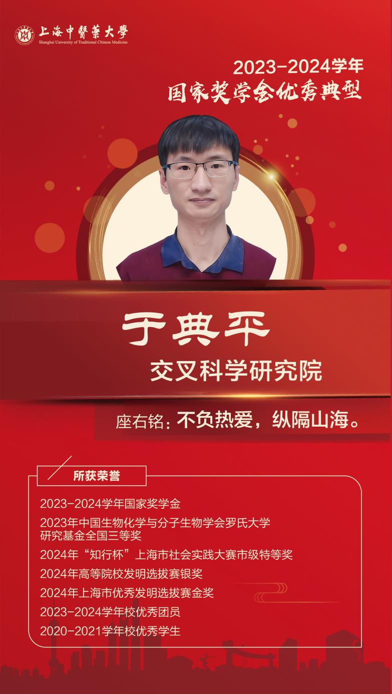 入校以来参与多个科研项目,具有较好的实验技能和文献研究能力;积极参加创新创业大赛并多次获得奖项。在学生工作与志愿服务中,她以实际行动诠释中医药学子的责任感与使命感,在多个岗位担任学生干部,获评优秀学生标兵和优秀学生干部等;累计志愿服务时长达400小时。未来,她将砥砺奋进,以更加坚定的信念迎接新时代的挑战,为中医药事业的发展贡献青春力量。