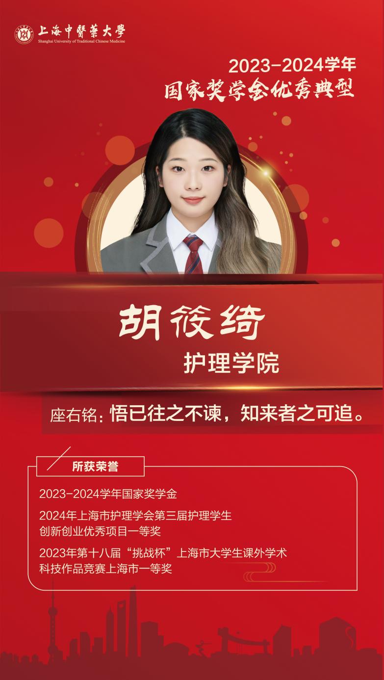 连续三年综测成绩排名第一,获得三次校一等奖学金。在实习期间,掌握护理常规技术,善于观察临床问题并乐于思考。曾获得2024年上海市护理学会第三届护理学生创新创业优秀项目一等奖、2023年第十八届“挑战杯”上海市大学生课外学术科技作品竞赛上海市一等奖等奖项。在过去的三年里,共担任过4项学生干部职务。曾任护理学院学术创新部负责人、层长、班级学习委员、团支书,在任职期间,全心全意为同学们服务。从懵懂到历练,从茫然到成熟,她将在自我成长的路上不断前行。
