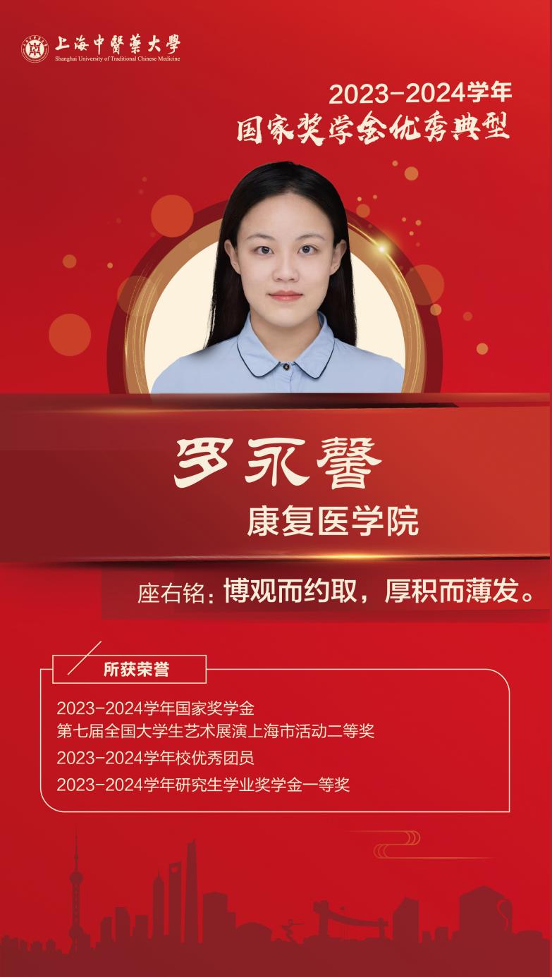 她在科研学习中严谨求实、勤奋钻研,积极探索镜像视觉反馈范式的临床运用,初步成果在中华医学会第二十三次全国物理医学与康复学学术会议上作口头报告,在导师路建伟教授的指导下,与课题组成员共同参与第18届国际物理与康复医学大会(ISPRM 2024, Sydney),完成了两项科研成果的交流报告工作;业余时间积极参与学校民乐团排练演出,荣获第七届全国大学生艺术展上海市活动二等奖,并参加中国-奥地利大学生音乐欣赏交流会等活动,积极宣传推广中医药和中国传统音乐文化;并多次参与志愿服务,尽力为他人提供帮助,协助南航乘务组成功处置急病旅客,获专信表扬,践行学以致用、回报社会、服务人民的责任与使命。