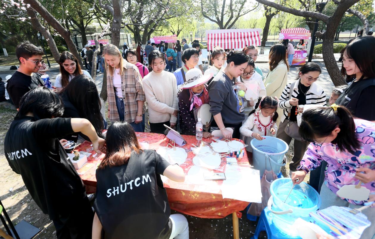 杏树下设置的文化交流展示区内,国际学生身着各自国家的民族服饰,展示本国杏花元素与健康理念。手工互动体验区成为跨文化交流的实践场所,以“指尖上的文明互鉴”为设计理念,设置漆扇区、制作花茶和香囊区、DIY大自然书签区和投壶区四大主题区域,将中医药文化与传统技艺融入互动实践。在漆扇制作中,国际学生通过“以漆为语,绘天地合”的艺术创作,展现了东西方智慧的融合;花茶与香囊制作则让学生深入体验了中药疗法的智慧;植物书签的制作融入了养生理念;投壶活动则通过传统游戏形式培养了参与者的思辨能力。活动最后,国际学生集体参观了上海中医药博物馆,通过沉浸式体验,完成了中医药文化溯源之旅。