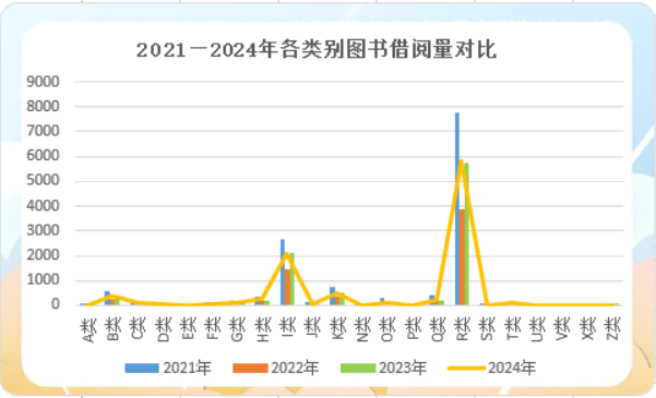 从2021年至2024年各类别图书的借阅情况来看,BEAT3652024年各类图书的借阅总量与2023年基本持平,但均低于2021年。