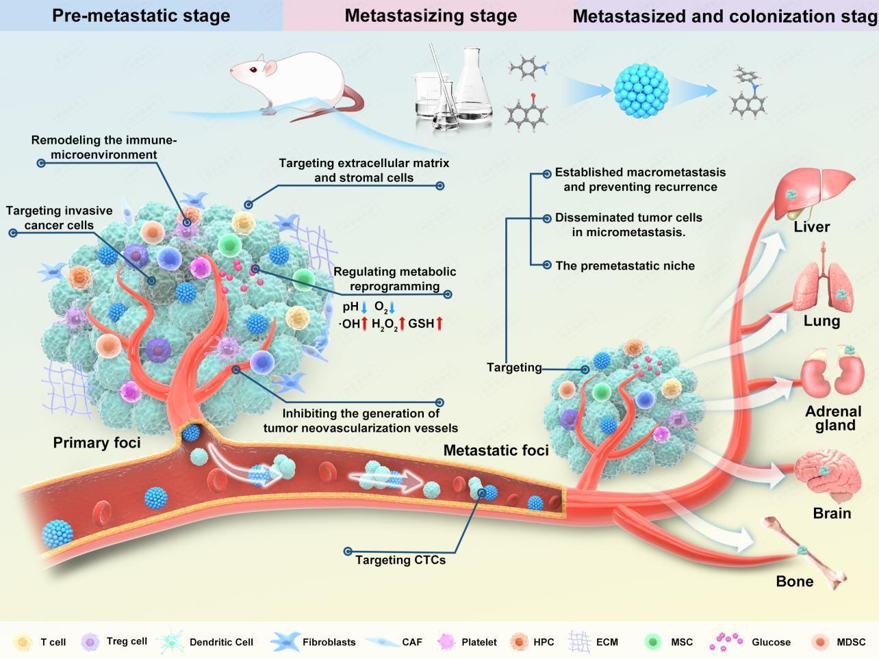 转移是肺癌患者预后不良的主要原因。传统防治措施如手术、放化疗、靶向、免疫、抗体药物偶联物及天然药物等对于改善肺癌转移患者的预后仍十分有限。近年来,纳米技术飞速发展,新兴交叉领域——肿瘤纳米医学,为肺癌转移的防治带来了新的希望。纳米材料因其良好的生物相容性、肿瘤靶向性、智能响应性控释、多药联合递送、抗多药耐药等特征,可用于制备高效的药物递送系统。此外,纳米材料因其特有的光、声、电、热、磁、酶或类酶活性等,可充分发挥药辅合一的优势和特色,在肿瘤转移防治领域展现出巨大的潜力。