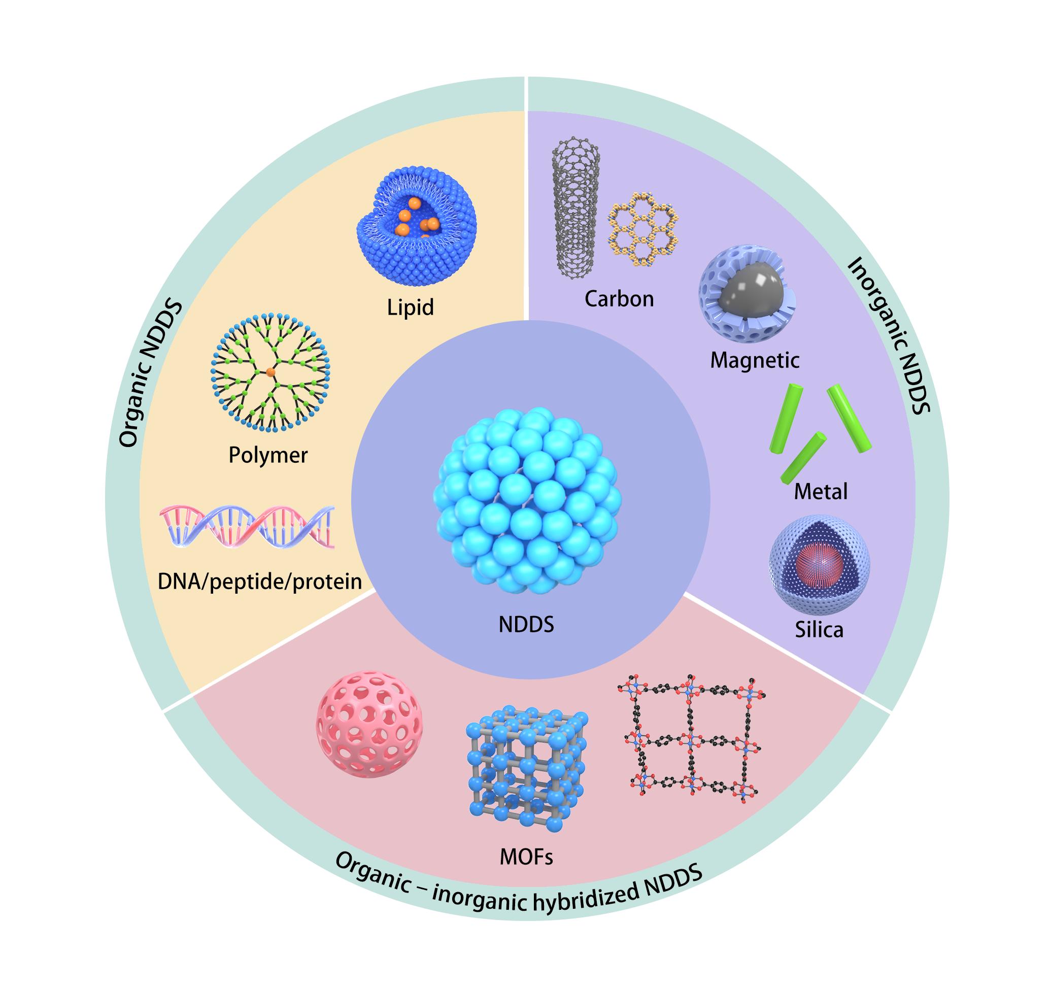 目前极具前景的纳米递送系统主要包括:有机纳米递送系统(如脂基、聚合物、DNA/肽/蛋白质基等);无机纳米递送系统(如碳基、磁性、金属基、硅基等);有机-无机杂化纳米递送系统(如金属-有机框架)。
