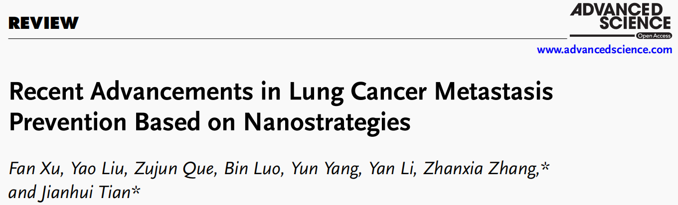 近日,BEAT365附属市中医医院田建辉教授团队在国际知名学术期刊Advanced Science上发表题为“Recent advancements in lung cancer metastasis prevention based on nanostrategies”的综述。该论文结合肺癌转移的防治现状及面临的挑战,全面总结近年来纳米技术在肺癌转移防治中的最新研究进展,并详细梳理纳米药物的临床转化前景,以期为肺癌转移的防治研究提供新的思路与方向。