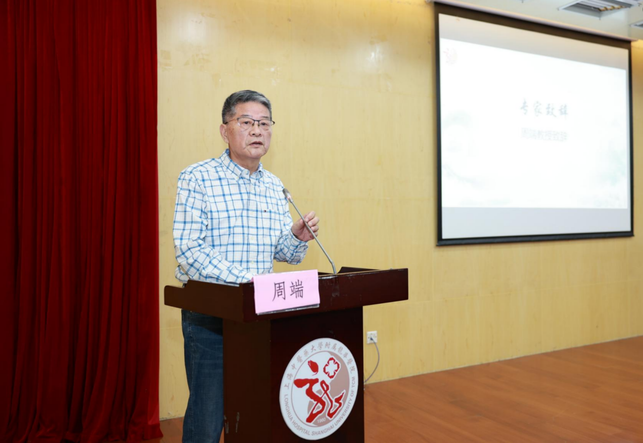 周端与大家一起分享自己的从医之路。他的主旨报告《学术轨迹形成浅析》展示其五十年学术成长的上下求索。他先后师从江克明、吴圣农、刘树农、姚培发等先贤,勤求古训,博采众长,汲取前辈学术思想,循经守正,推陈出新,形成自己的学术观点。他表示:作为医者,潜心医道,静心行医,是一生的追求;作为教师,授道解惑,诲人不倦,是义不容辞的担当;作为龙医人,严谨,仁爱,继承,创新,是毕生的使命。