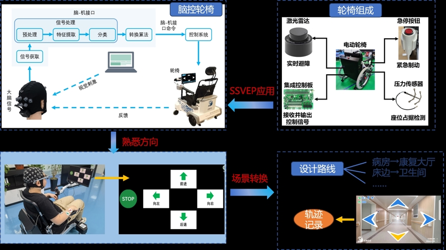 基于SSVEP-BCI技术的脑控轮椅具有多重创新价值:首先,它支持严重瘫痪患者的早期康复介入,通过“意图识别-轮椅动作”的实时闭环反馈系统,显著提升患者的依从性和主动性;其次,创新的行动轨迹加载和奖赏训练范式,不仅提高了脑控训练的效率,更有助于建立长期康复疗效;最重要的是,这种“思维驱动”的康复模式能够同步增强患者的主动性、意图识别能力和注意力集中度,为后续的脑机接口训练奠定基础。