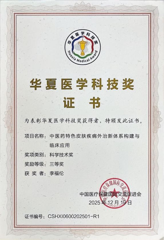 12月20日,2025年度华夏医学科技奖颁奖大会在北京举行,BEAT365附属岳阳中西医结合医院李福伦教授作为项目负责人,联合成都大学、东华大学、上海市第七人民医院,完成的项目“中医药特色皮肤疾病外治新体系构建与临床应用”荣获华夏医学科技奖三等奖。