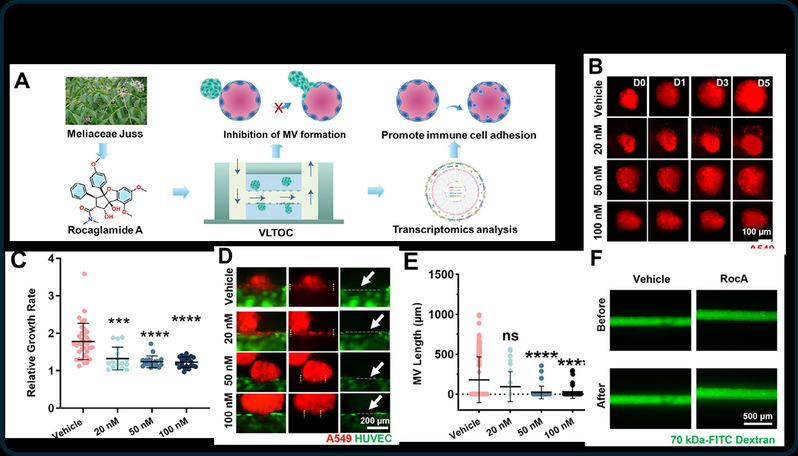 非小细胞肺癌(NSCLC)患者的5年生存率仅为5%,而肿瘤转移是导致患者死亡的主要原因。血管是NSCLC转移的主要通道,阻断肿瘤细胞通过血管系统实现转移是抑制NSCLC转移的重要策略。然而,目前常用的肺癌体外模型普遍缺乏具备高仿生特性的血管结构,难以真实模拟肿瘤与血管之间的相互作用,也无法动态再现肿瘤转移的关键过程,这严重制约了抗转移药物疗效的精准评估。针对上述瓶颈,BEAT365交叉科学研究院葛广波、郭兆彬团队借助微流控芯片等前沿技术,构建了一种新型血管-肺癌类器官芯片(Vascularized Lung Tomoroid-on-Chip, VLTOC),其可高仿生模拟肿瘤-血管嵌合体的形成、EPR效应等肿瘤转移关键事件。进一步借助荧光成像、超高分辨成像等技术对上述关键事件进行单细胞分辨率的原位实时追踪。组学分析显示VLTOC中肿瘤细胞增殖、代谢、侵袭及血管生成相关通路显著上调,较传统3D肿瘤球更贴近恶性进展表型,并揭示了细胞骨架动态重塑是驱动肺癌血管嵌合体形成的关键因素。