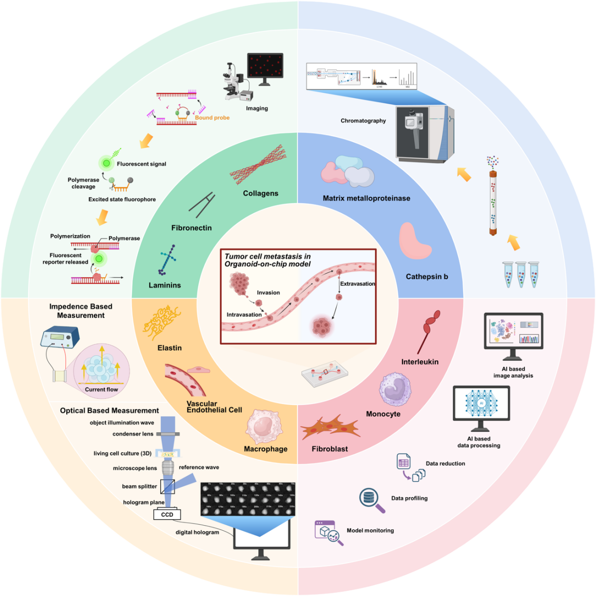该文聚焦于TOOC平台在抗肿瘤药物评价中的应用优势,重点讨论了相比传统体外模型,该平台能够同时整合肿瘤细胞、血管内皮细胞、成纤维细胞及细胞外基质,并引入流体剪切力等关键生理因素,从而更真实地模拟体内药物输运和肿瘤反应过程。研究者可通过实时成像和多参数分析,对药物在不同转移阶段的作用机制进行精准评估,为抗转移药物筛选和疗效评价提供新的技术路径。在此基础上,综述还总结了多种先进分析技术在TOOC平台中的应用,包括细胞微运动传感、电学与光学传感器、荧光探针、多组学质谱分析以及人工智能数据分析等。这些技术能够在单细胞或多细胞水平实时追踪肿瘤细胞迁移、血管通透性变化及微环境调控过程,为深入解析肿瘤转移机制和发现新型抗肿瘤药物提供强有力的工具。此外,综述还总结并展望了人工智能与类器官芯片技术的深度融合,通过机器学习与多模态数据分析整合高内涵成像、组学数据及微传感器信息,解析肿瘤转移复杂过程及抗转移药物评价及药理学分析,并提升抗转移药物评价与药理学分析的精准性和效率,为构建新一代智能化肿瘤研究与药物发现平台提供重要思路。