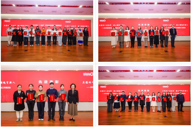 会上举行了2026年“一站式”学生社区学生兼职住楼辅导员聘任仪式,并对2025年度在就业、征兵、创新创业工作中表现突出的先进集体与个人,在导师团特色工作法、“十佳导学团队”、校优秀辅导员、上海市“最美高校辅导员”等校级、市级、国家级各类评选竞赛中获得佳绩的师生代表进行了表彰。