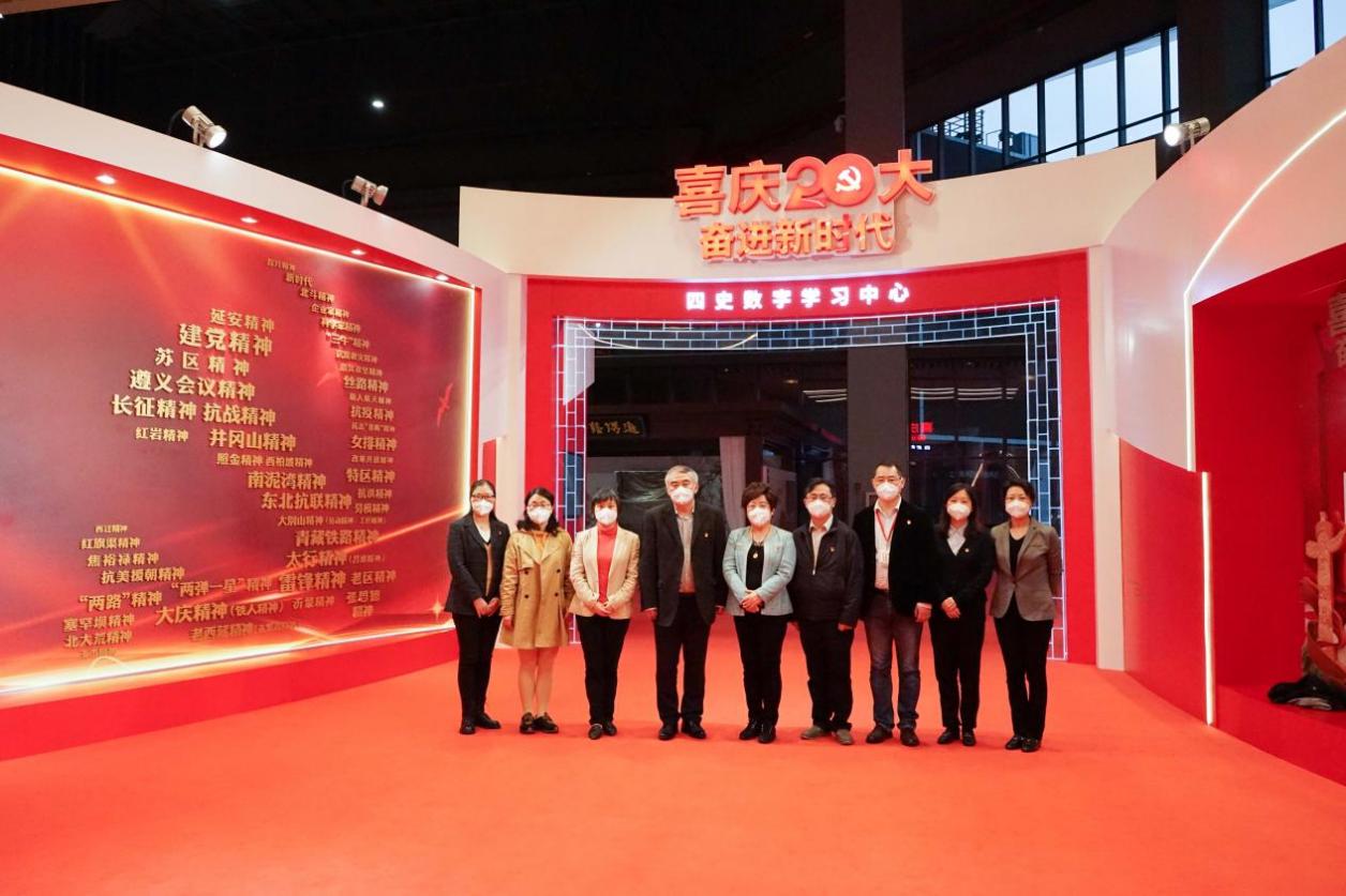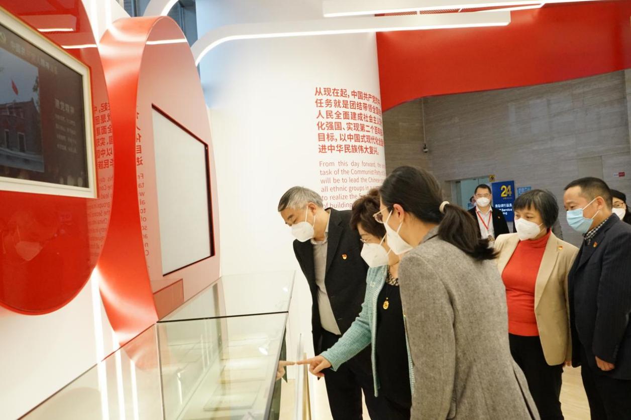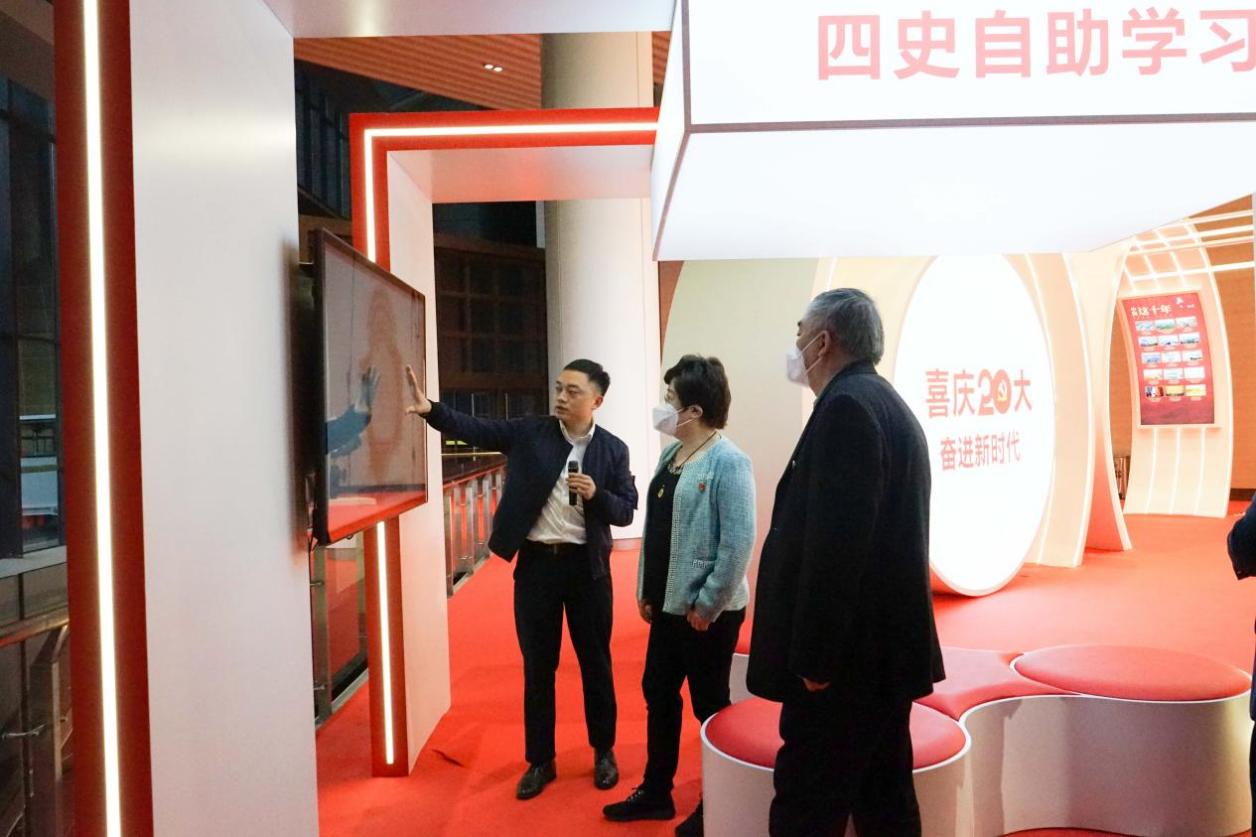 一行人首先走进了国家会展中心(上海)党群服务中心。中心内主要设置有党史数字学习区、党建书苑公共阅览区、党史文献区、党群服务便民区、宣誓墙、伟大建党精神区等,是党员教育基地、群众办事平合、行业交流阵地。以“党员群众需求在哪里,党的阵地就覆盖到哪里,党的服务就延伸到哪里”为出发点,把党群服务阵地延伸到进博会最前沿,是本届进博会党建引领的一个缩影。