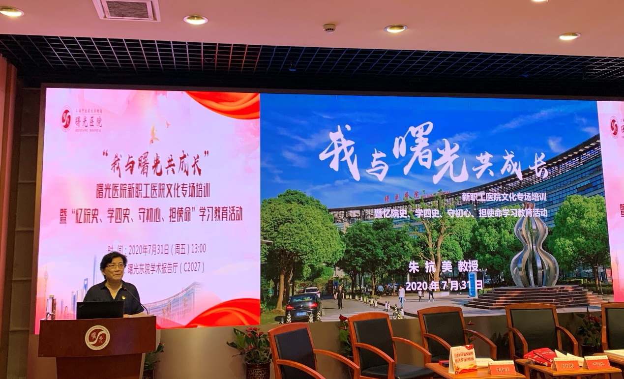 朱抗美分享了一张老照片,照片中的曙光人身着白色战袍,自信昂扬走在曙光道路上,她与曙光共成长的故事,便是从这里开始。朱抗美将百年积淀的院史,糅合了深厚、独特的曙光文化娓娓道来。从院训到院歌、从建院初衷到历代人才辈出、从首创“伦理查房”到开通国内首条免费“中医健康热线”、从曙光人积极投身抗震救灾到奋战非典和新冠肺炎……她同曙光共成长。朱抗美以院史引领新曙光人在学习中坚定前行方向,添动力、找差距、谋进取,勉励新一代曙光人不忘创立之初慈善发源,传承前辈优秀品质,用“病人至上,质量第一”的宗旨和曙光精神开辟新天地、迎接新气象、造就新曙光。