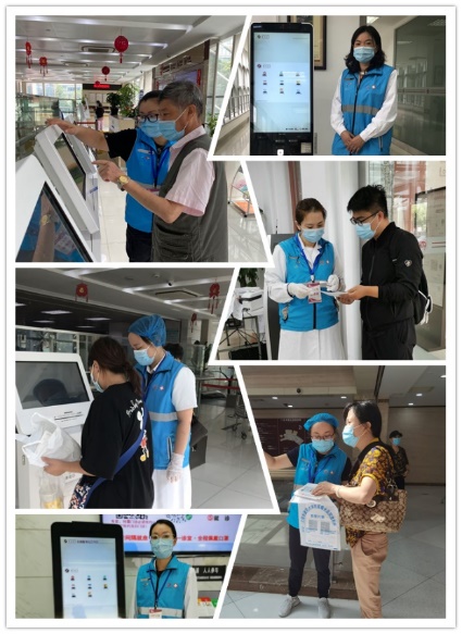学员们穿上志愿者蓝马甲,来到门诊、诊间为就诊患者提供导医导诊、引导使用自助机挂号付费等,以实际行动践行志愿者精神,时刻牢记全心全意为人民服务的宗旨。
