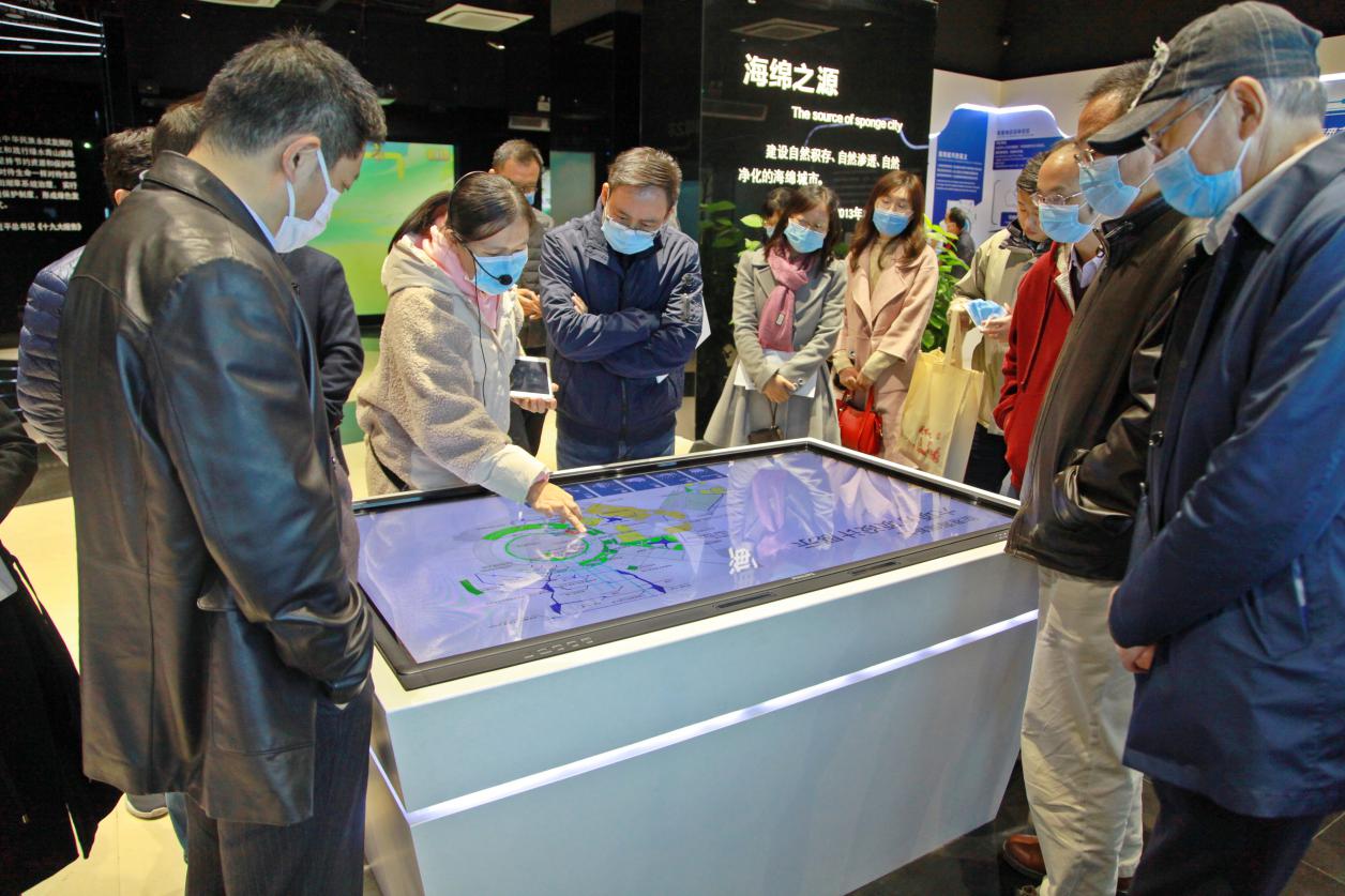 交流活动结束后,会员们一同参观了上海临港海绵城市展示中心,学习临港新一代城市雨洪管理概念,通过声、光、电等现代科技手段,并采用三维动画影片、大屏幕、影视墙、游戏互动等表现形式,展示海绵城市规划成果和原理知识。
