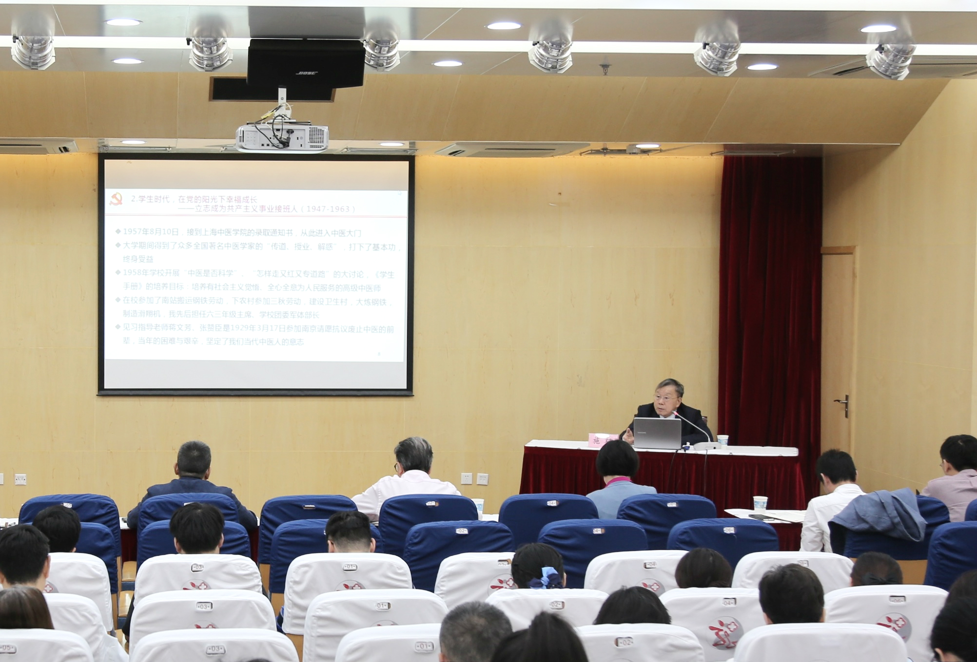 在一个半小时的党课中,施杞教授娓娓道来,介绍了他自己作为中医人坚持不忘初心、牢记在共和国的旗帜下的成长历程。在童年时期孕育初心,在学生时代筑梦中医,在中壮年时期圆梦中医,及至老年依然追梦中医的故事,展现了一名老共产党员医者的初心和使命。施杞教授说:“我是新中国的阳光下成长起来的中医人,亲身体会到中国人民站起来、富起来、强起来的奋斗历程,也亲眼目睹了我国中医事业在党的关怀下枯木逢春、获得新生。”施杞教授寄语广大中医人心中要始终保持三个坚定:坚定信念,不忘初心;坚定政治站位,牢记使命;坚定伟大的中国梦必胜,中华民族伟大复兴必胜。