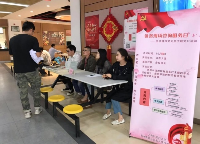 10月16日中午,图书馆党总支图书情报党支部结合党员的岗位特色,面向学校师生开展了一次读者现场咨询服务。咨询内容主要包括图书馆的基本服务、电子资源及学科分析等。为了让更多师生能够知晓此次活动,享受此项服务,图书情报党支部将活动地点设在人流量大的学生食堂一楼入口处,并选在中午师生用餐高峰时段开展此项活动。