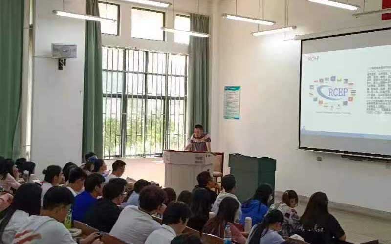 毕书记首先以RCEP对中国与东盟经贸合作的重大意义开场,紧接着介绍了中老铁路的发展历程及现状,展望了中老铁路在未来发展中的作用,图文并茂介绍了磨憨口岸出入境流程,最后深入浅出的讲解了RCEP对中老铁路的助推以及中老铁路未来三年的行动计划。最后勉励同学们在校期间能学好专业知识,毕业后为我国对外贸易事业贡献出自己的一份力量。