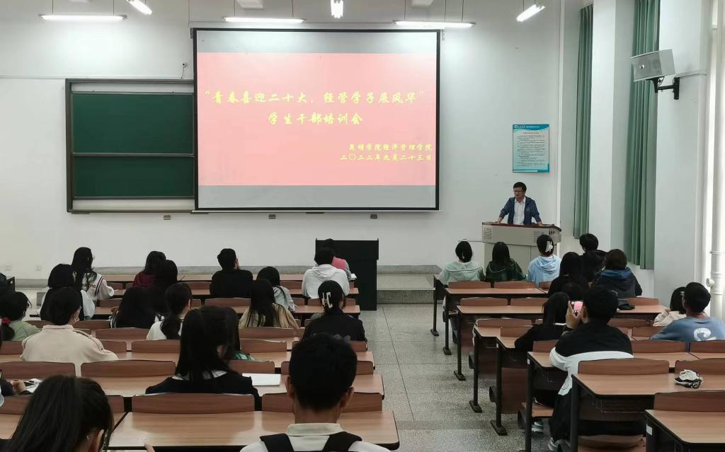9月23日,必赢国际437官网在博雅楼3103开展了以“青春喜迎二十大,经管学子展风采”为主题的学生干部培训会,学院党委书记樊传章、团委负责人王晗奕老师出席了本次活动。