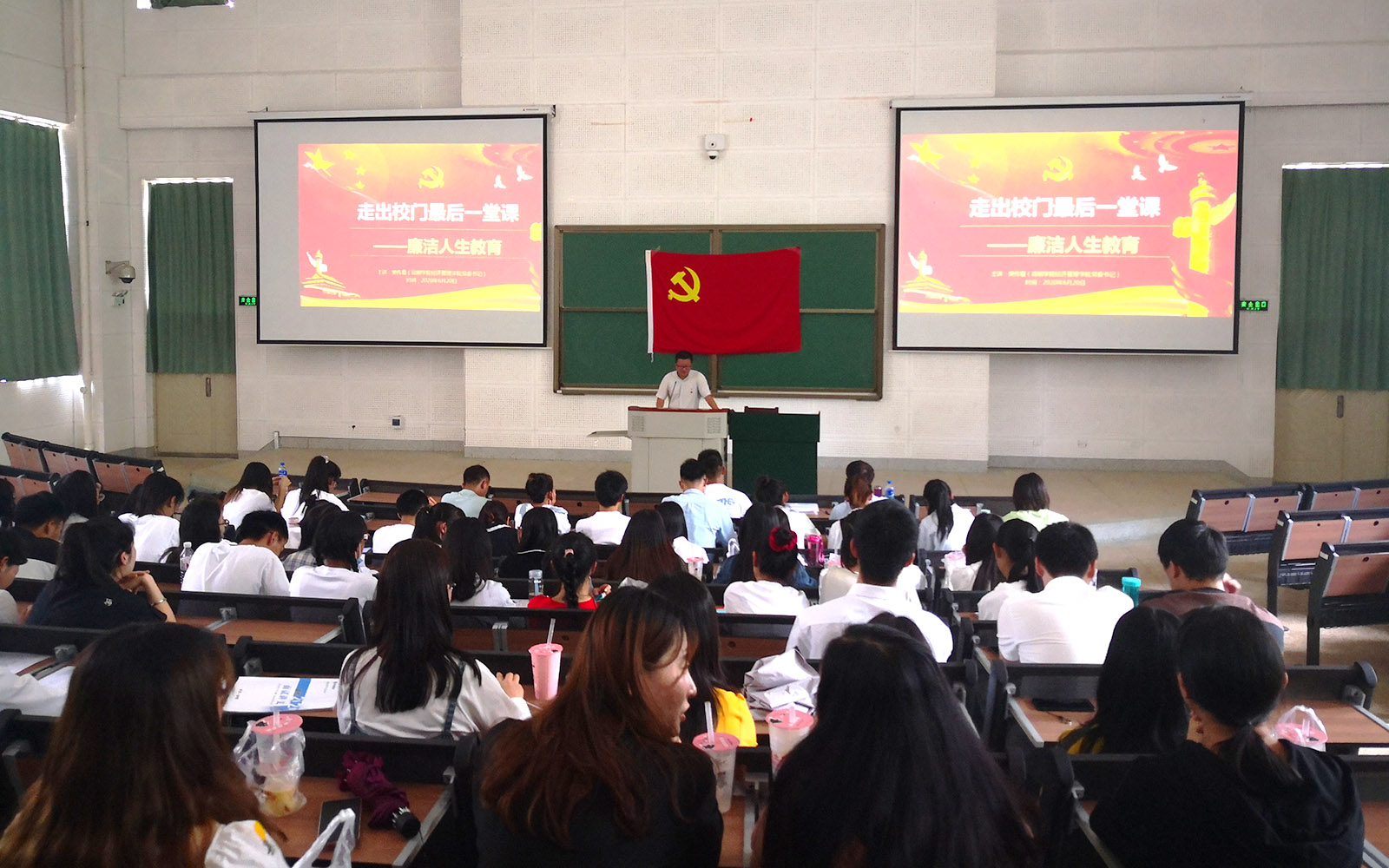 党课第一阶段以“走出校门最后一堂课——廉洁人生教育”为主题,通过解读《中国共产党廉洁自律准则》,教育学生党员们要牢固树立“四个意识”、坚定“四个自信”、坚决做到“两个维护”,自觉学习《准则》和《条例》,做到心中有戒,通过鲜活的案例警示学生党员们,在今后的生活和工作中要不忘初心、信念坚定,将“崇廉守洁,抱诚守真”的精神牢牢铭记。