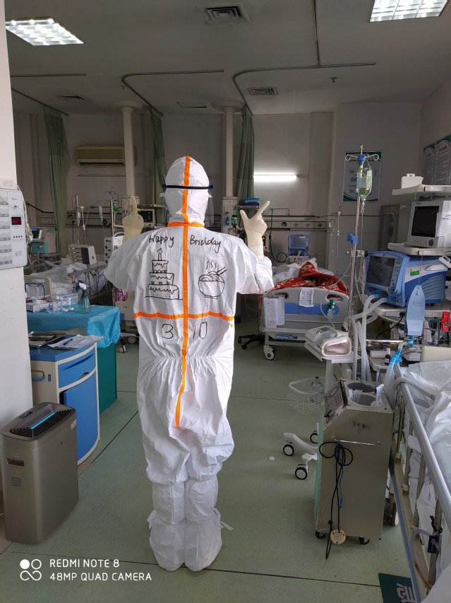 武汉市第三医院光谷院区,上海市中医医院医疗队员奚洁在紧张的工作之余也祝自己生日快乐