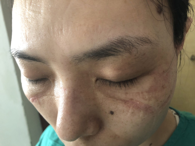 2月4日立春,在武汉市第三人民医院重症监护病房连续工作12小时后的岳阳医院祁伊莉走出病房,脸带压痕