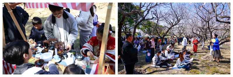 “杏林游园”是由大学生社团搭建的传统与现代交融的育人场域。活动将传统中医药技艺与青年创意相结合,通过香囊制作、中药材辨识等互动环节,使参与者在实践体验中感受杏林文化的独特魅力。同时,剪纸艺术、书法展示等非物质文化遗产项目,配合汉服展示与功法教学,为校园营造出浓厚的传统文化氛围,实现了美育教育的沉浸式体验。在杏花掩映下开展的“吟诗赏花说医药”活动中,师生把医药文化和红楼诗词结合,身心并调,领悟天人合一之境和传统文化之美,在学术交流中树立文化自信。