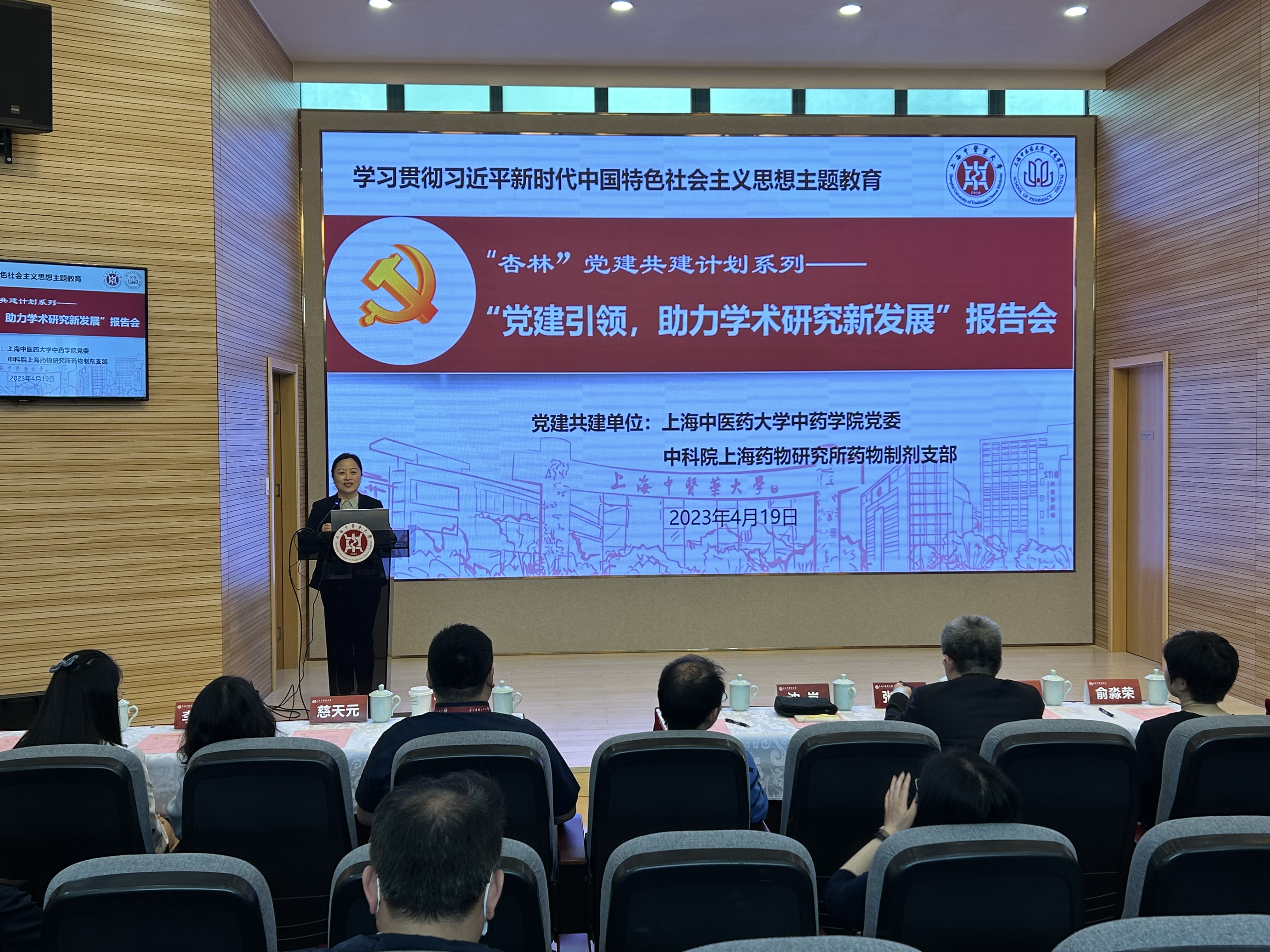 为深入学习贯彻习近平新时代中国特色社会主义思想和党的二十大精神,进一步发挥基层党组织的政治功能和组织力,4月19日,中药学院党委与中科院上海药物研究所药物制剂党支部在全球合作伙伴中心一楼报告厅开展党建共建活动,召开以“党建引领,助推学术研究新发展”为主题的报告会,旨在将理论学习与学术研究深度融合,积极探索以党建引领学科高质量发展的新模式。中科院上海药物研究所药物制剂党支部师生党员、中药学院领导班子成员和师生党员参会。报告会由中药学院党委书记沈岚主持。