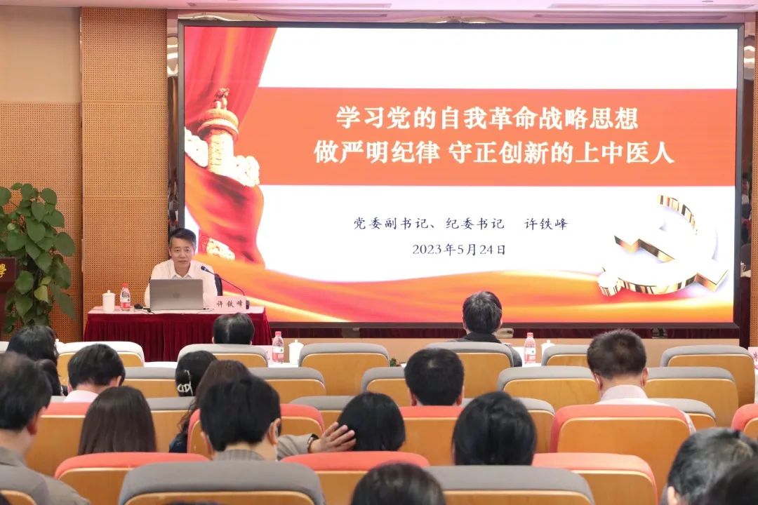5月24日下午,学习贯彻习近平新时代中国特色社会主义思想主题教育读书班在行政中心301会议室举办,校党委副书记、纪委书记许铁峰作“学习党的自我革命战略思想,做严明纪律、守正创新的上中医人”主题教育专题党课。校主题教育领导小组成员,校党委中心组成员,校本部教师党支部书记,组织员、辅导员,马克思主义学院全体教师参加集中学习。党课由副校长王拥军主持。