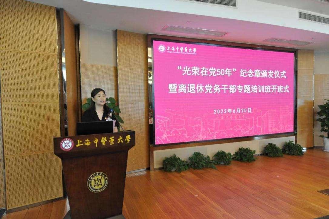 在“光荣在党50年”纪念章颁发仪式暨离退休党务干部专题培训班开班式上,校党委副书记、副校长朱惠蓉出席,党委组织部部长、党校常务副校长王璐主持会议,校原党委书记、退休局级干部党支部书记张建中宣读了荣获“光荣在党50年”纪念章党员名单,朱惠蓉和张建中为七位老党员颁发“光荣在党50年”纪念章。